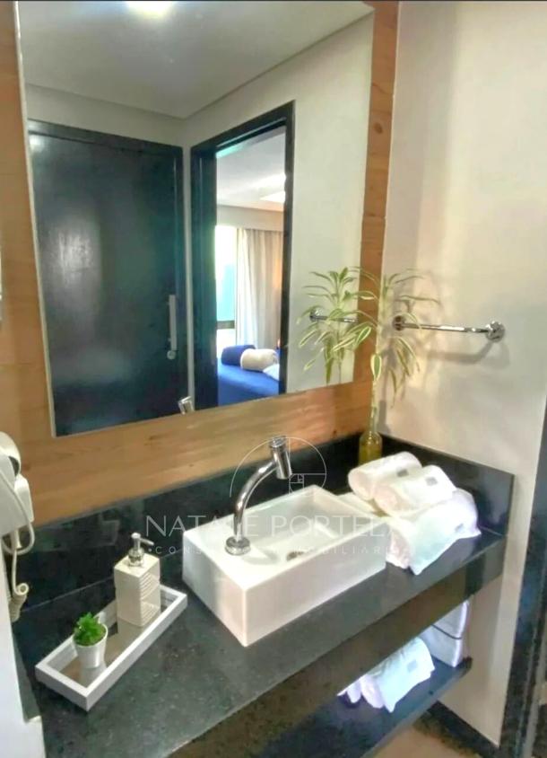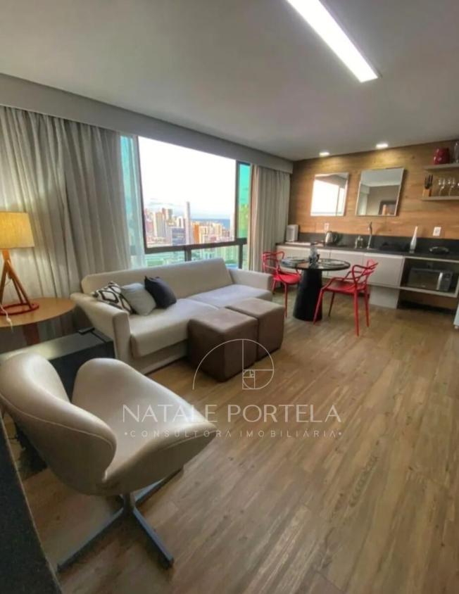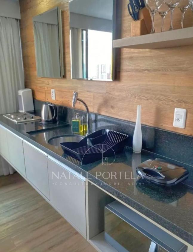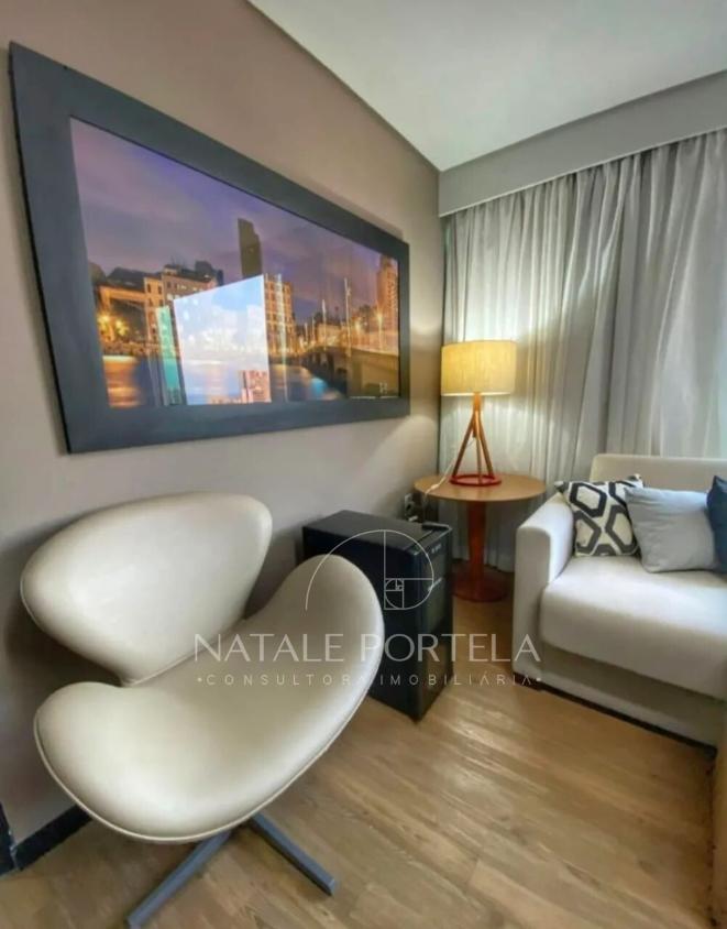Apartamento com 42m2 distribuído em ampla sala reformada e decorada, com uma cozinha integrada, 1 banheiro e 1 quarto.